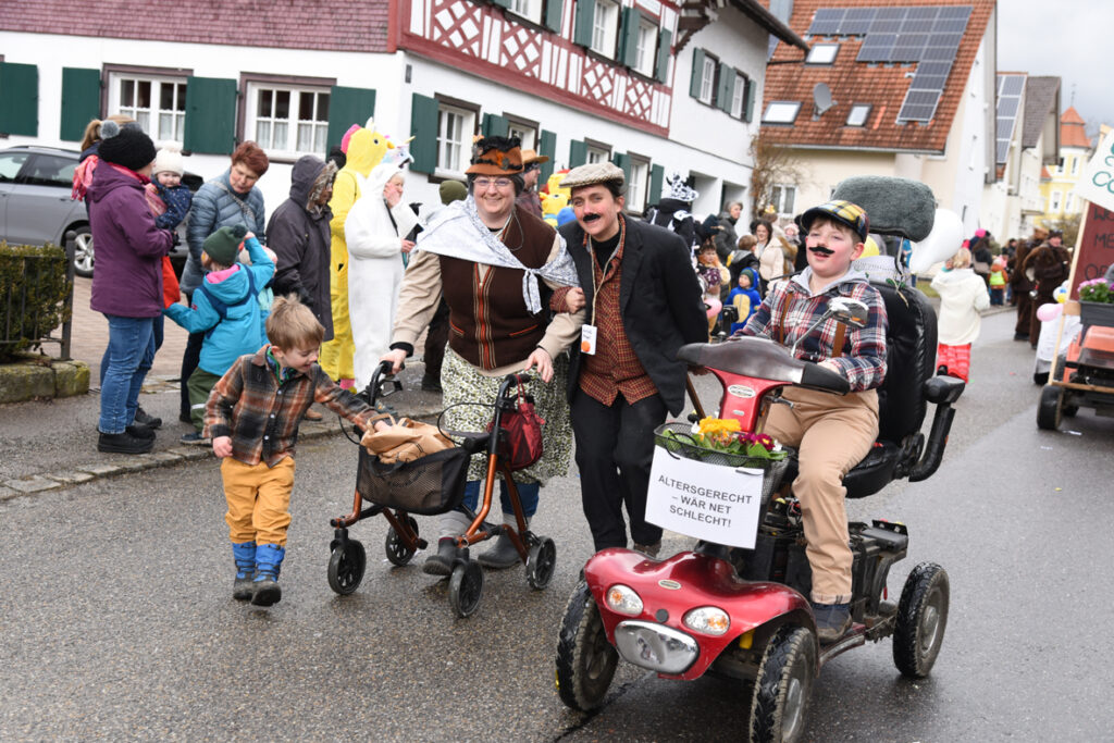 Das ganze Dorf war am Dienstag auf Fasnacht eingestellt: Die Häuser waren mit Luftballons geschmückt, vor vielen Eingängen hatten die Anwohner kleine Bars aufgebaut. Fantasievoll verkleidete Narren säumten gut gelaunt den Umzugsweg und sorgten für beste Stimmung.
