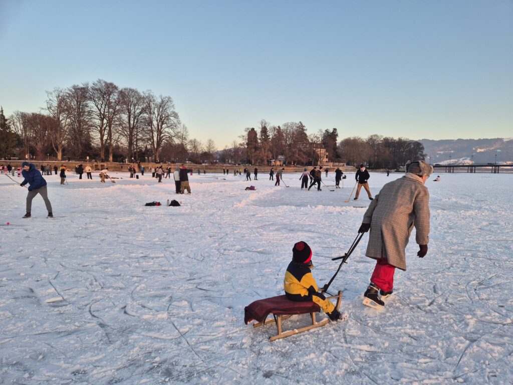 Manche bauen Grills auf, andere richten kleine Lager mit Tee und Kuchen ein, Eishockeyschläger klacken über das Eis – in den vergangenen Tagen zog es viele Lindauerinnen und Lindauer auf den Kleinen See. Gleichzeitig warnen Wasserschutzpolizei und Stadt vor den Tücken der gefrorenen Fläche. Die Wasserwacht bereitet sich vor und probt den Ernstfall. Wie gefährlich ist es auf dem Eis?
