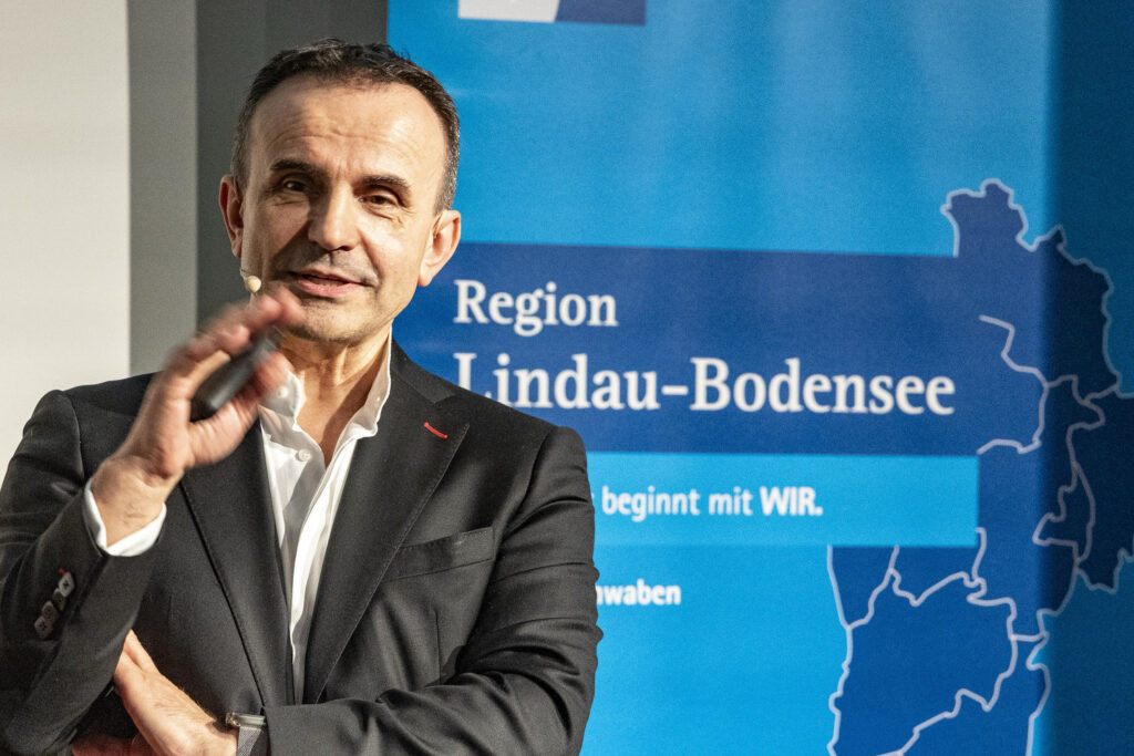 Professor Pero Mićić zeigt beim IHK-Neujahrsempfang in Lindau auf, warum ein Bild der nächsten Ära für eine Firma wichtig ist und welche Rolle die KI dabei spielt.