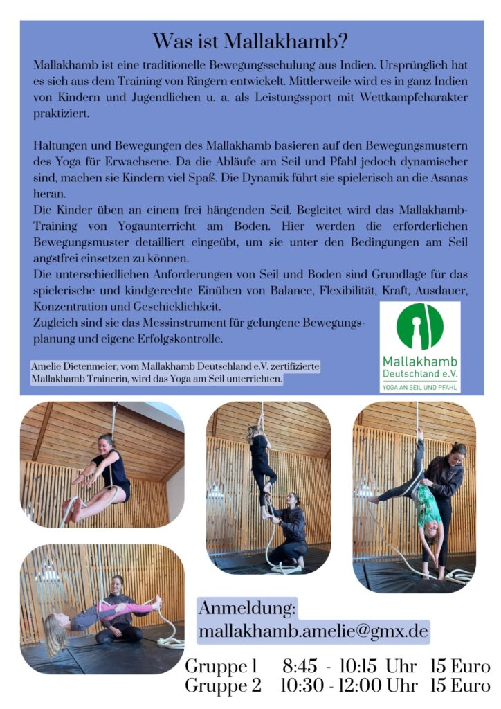 Mallakhamb ist eine Bewegungsschulung aus Indien, die ursprünglich von den Ringern entwickelt wurde. Kinder lernen spielerisch Flexibilität, Konzentration, Ausdauer, Kraftaufbau, Balance und geschicklichkeit. Yogahaltungen werden am Seil eingeübt.