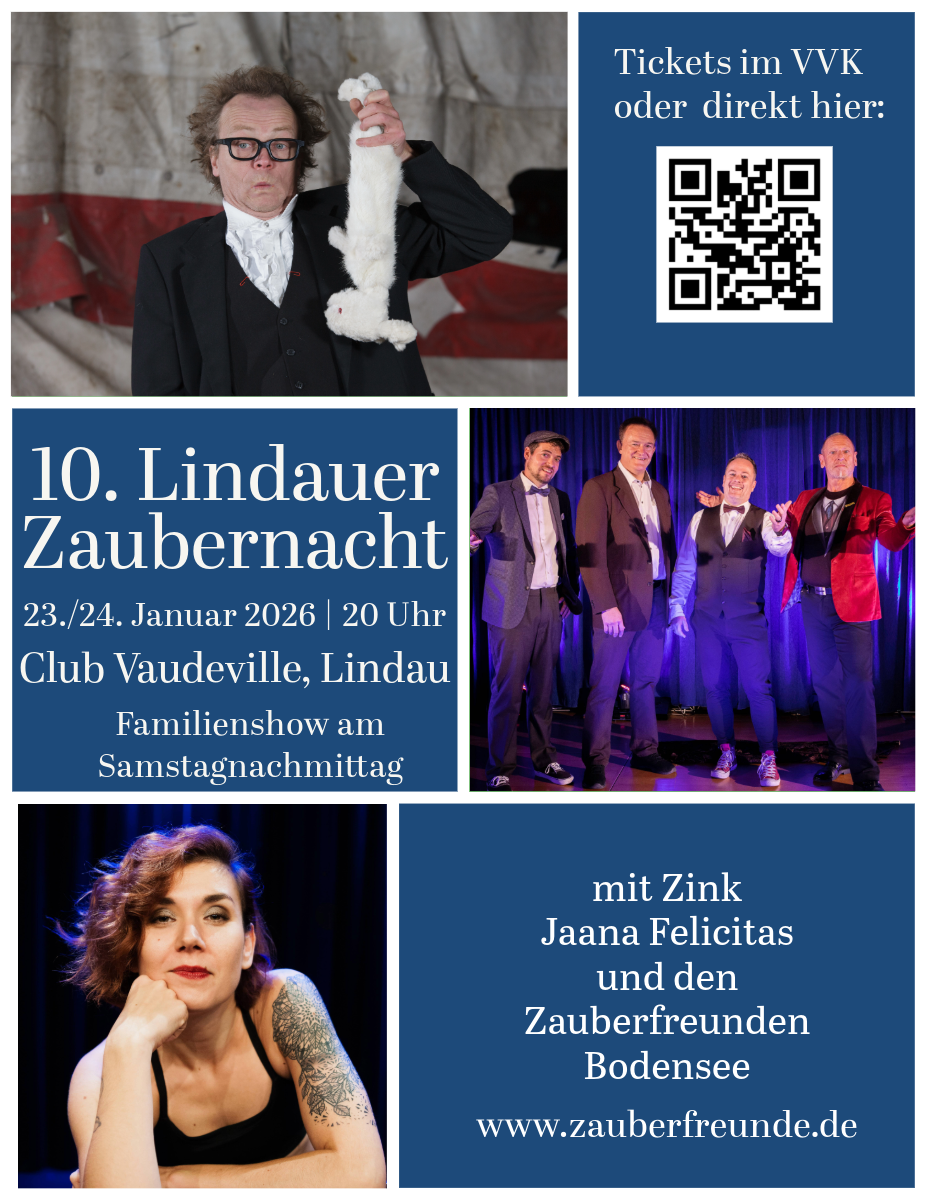 Darauf haben viele gewartet: Die Lindauer Zaubernacht geht in die nächste Runde! Zum 10. Mal präsentiert die seit über 25 Jahren existierende Truppe verschiedenartiger Zauberkünstler aus der Region, auch „Magischer Zirkel Lindau“ eine bunte Mischung aus Magie, Illusion, Comedy, und interaktiver Zauberkunst. Es gibt nicht nur neue hochkarätige Zauberacts zu sehen, sondern auch eine neue Location: Erstmals wird die Lindauer Zaubernacht am Freitag und Samstag, 23. und 24. Januar 2026 in den Räumen des Lindauer Club Vaudeville stattfinden! Tickets sind das perfekte Weihnachtsgeschenk!