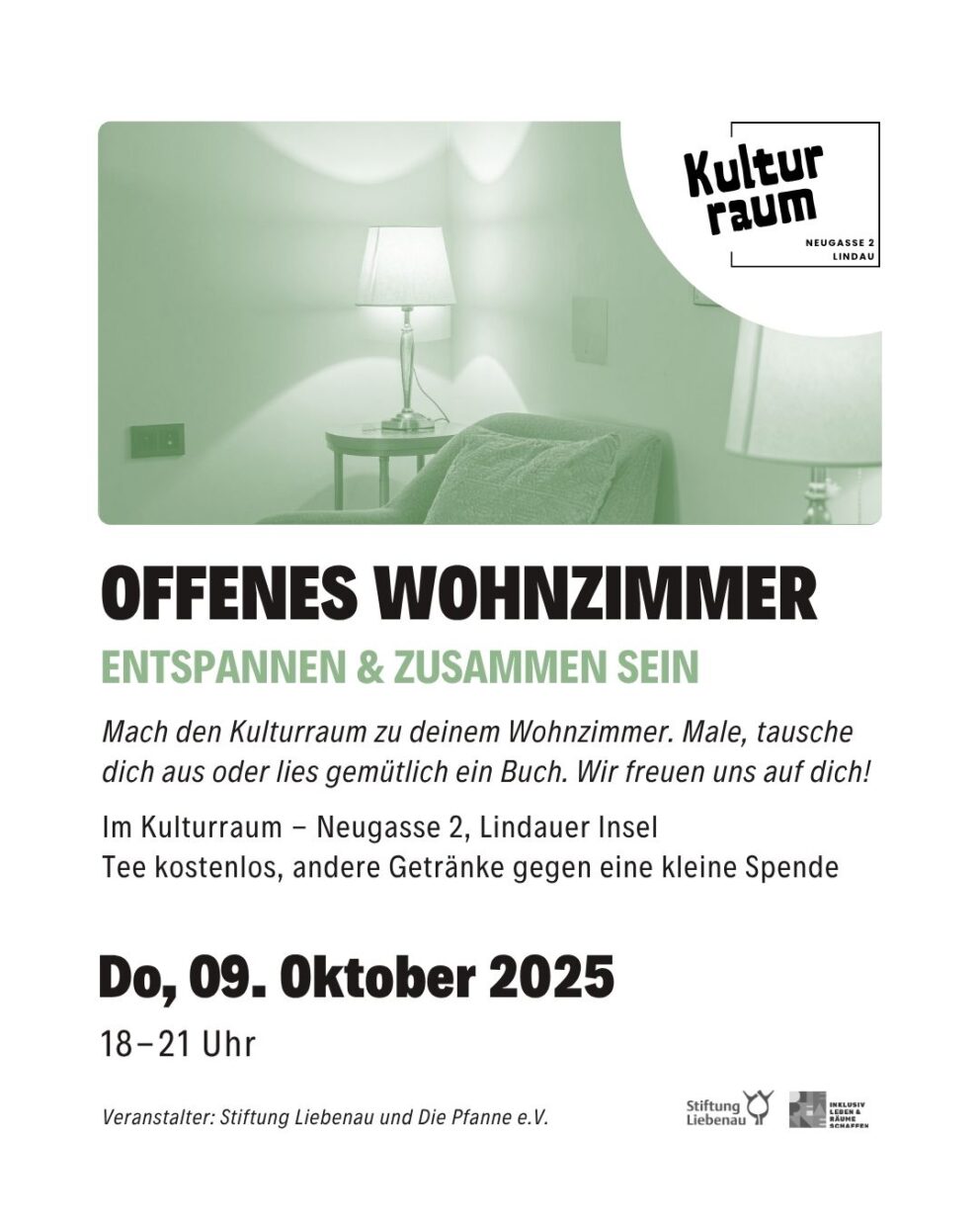 Der Kulturraum wird zum Wohnzimmer für alle. Für alle die einfach mal vom Alltag abschalten möchten und einen Ort suchen, um gemütlich zusammen zu sein. Musik hören, malen, stricken, ein Buch lesen, ein Spiel spielen oder sich mit anderen unterhalten – ganz so, wie es für jeden passt, ohne etwas konsumieren zu müssen. Tee und Wasser gibt es kostenlos, wer mag kann auch sein eigenes Essen mitbringen.