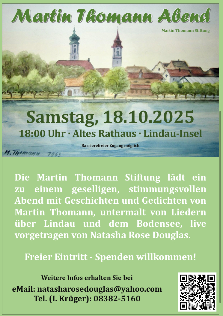 Die Martin Thomann Stiftung lädt ein zu einem geselligen, stimmungsvollen Abend mit Geschichten und Gedichten von Martin Thomann, untermalt von Liedern über Lindau und dem Bodensee, live vorgetragen von Natasha Rose Douglas